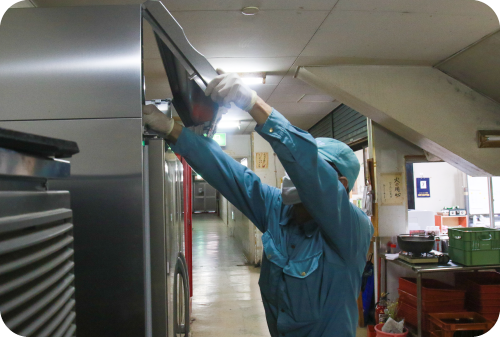 什器下のゴミのかき出しや、侵入経路や巣となる割れ目やすき間を閉鎖するなど、ゴキブリが生息できる状況をつくらないためのアドバイスを行います。
